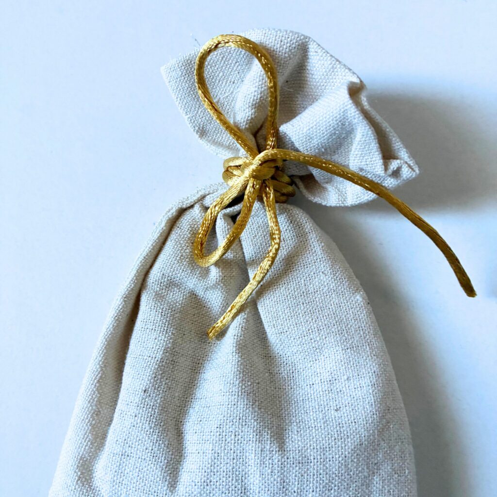 価格は330円(税込)ですが、パッと見た印象はそれ以上。ナチュラルな布製の巾着に、ゴールドのひもがアクセントになった上品なデザインです。